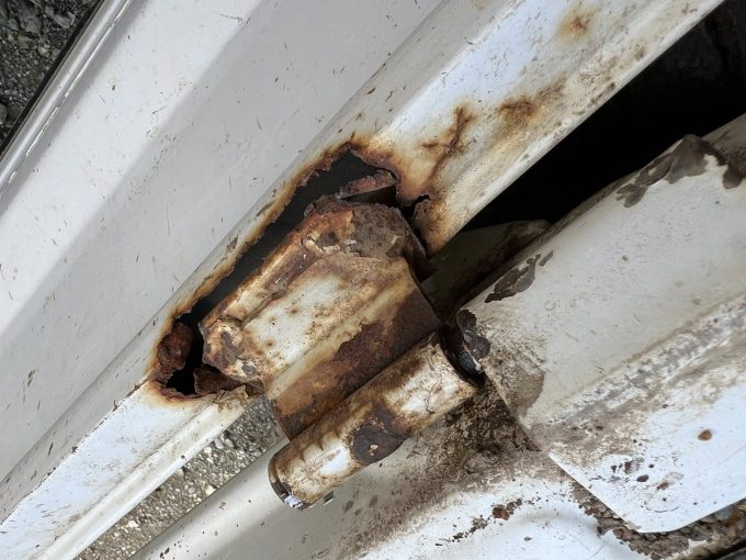 ■なかなか酷いサビ、そして蝶番根元からの崩壊・・・。これ、治るんかいな??