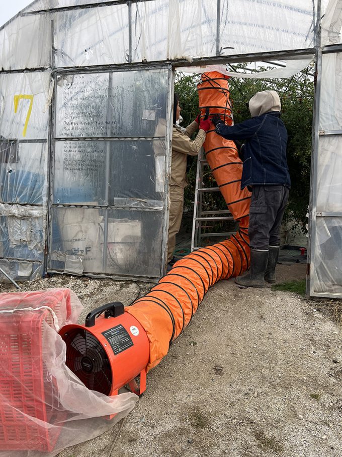 ハウス内上部にダクトを通して外気を強制導入するんですが、ハウス内が涼しい!