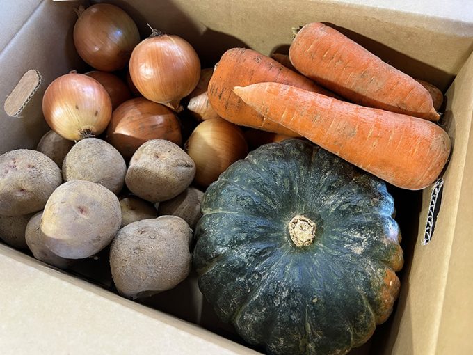 ジャガイモ、ニンジン、タマネギ、カボチャ。とってもおいしい野菜を詰め込んでお届けしています。