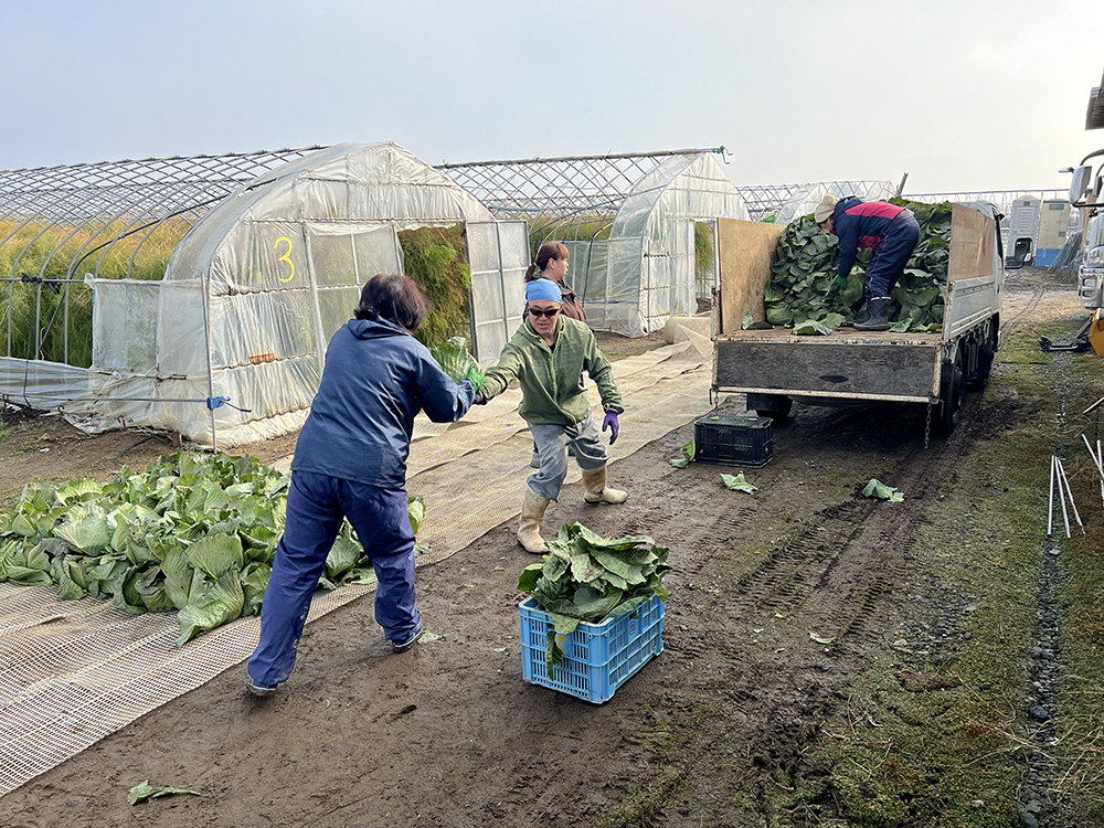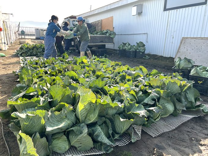 先々週、仲間の農家さんから雪下キャベツ入荷。雪中保存するために寺坂農園の敷地内にネットを敷き、その上に列べていきます。