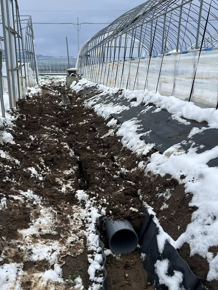 メロンハウス後ろにある明きょ排水。土を掘っただけの排水路だったんですが、奥のアスパラガスハウスとの間が狭く、排水の傾斜で歩くと滑るし歩きづらいしと…。