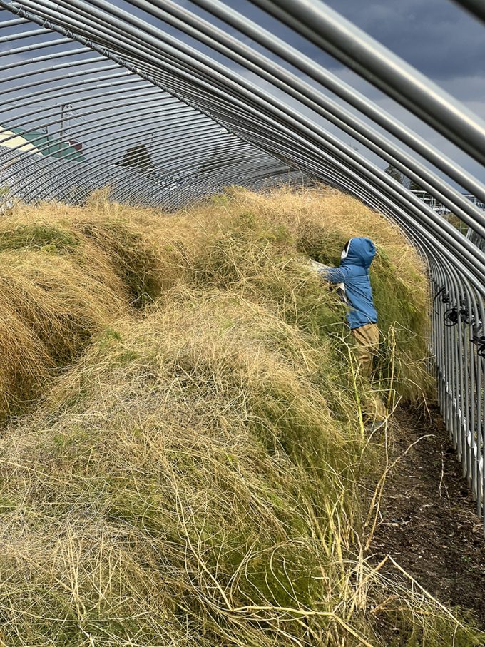 身長以上に、モンスターのように大きく育ったアスパラガスの茎葉をハウスの内側に倒していくのは、なかなか体力いります。