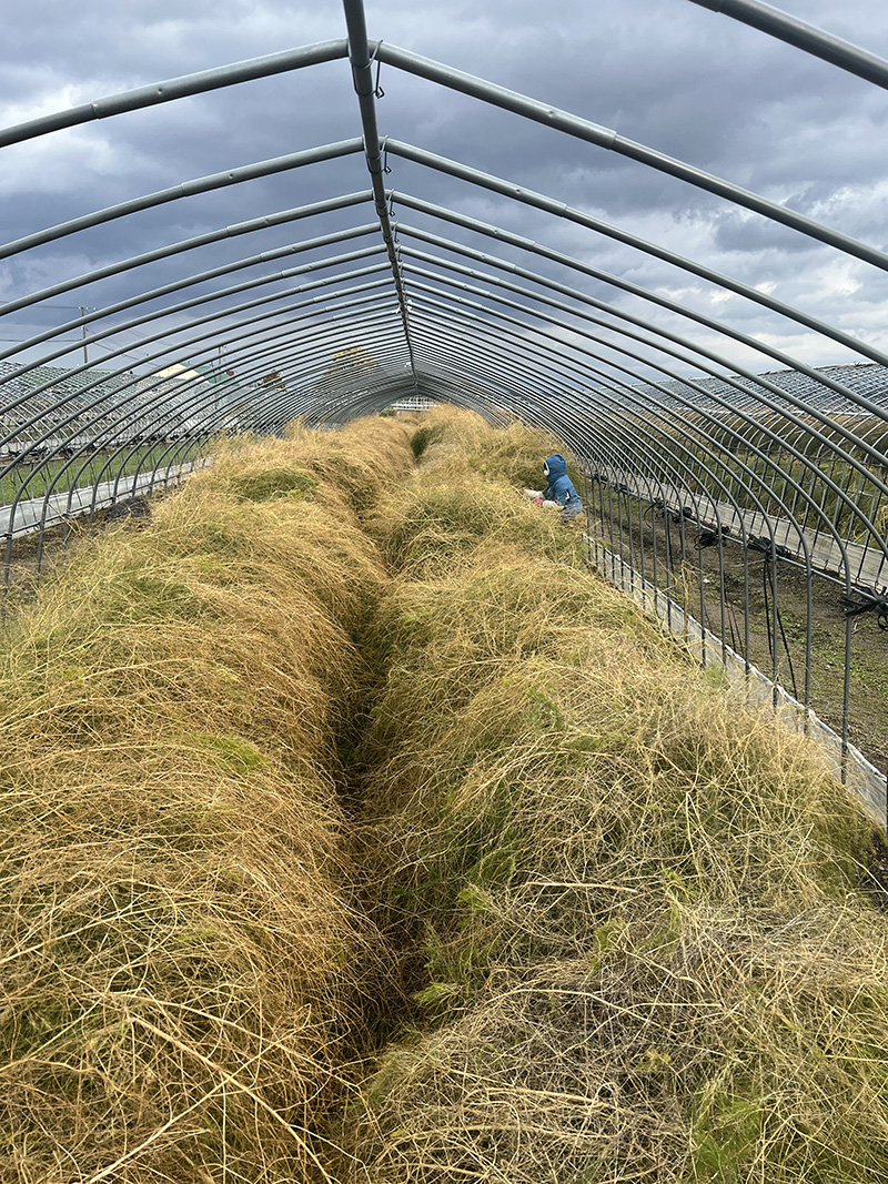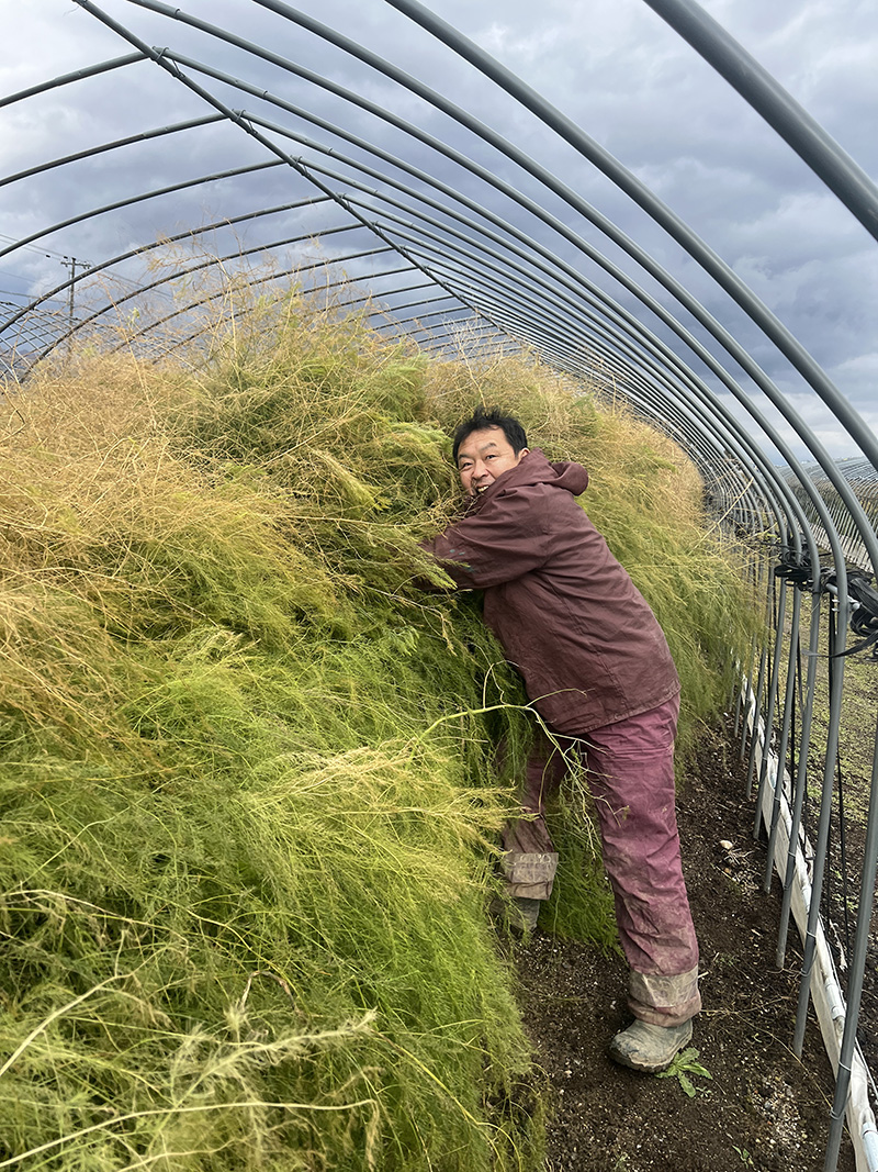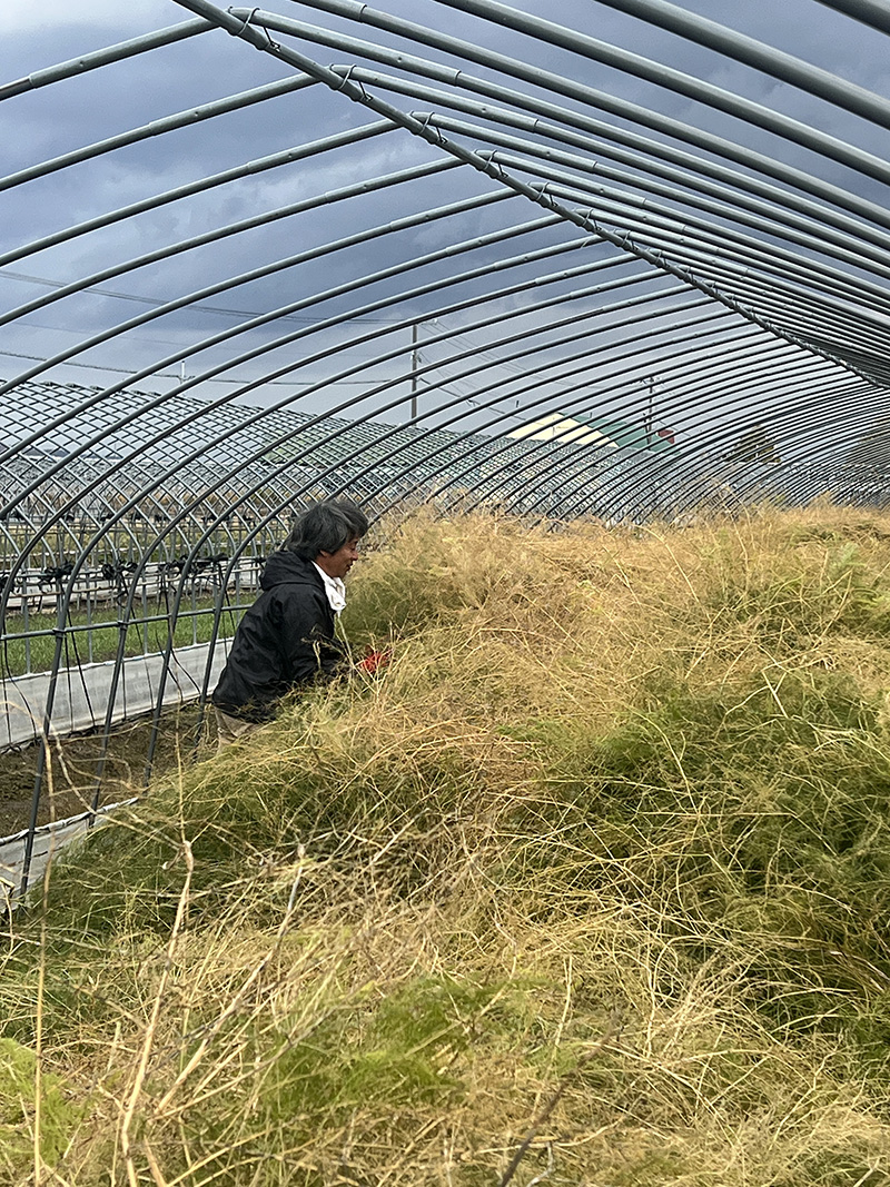 身長以上に、モンスターのように大きく育ったアスパラガスの茎葉をハウスの内側に倒していくのは、なかなか体力いります。