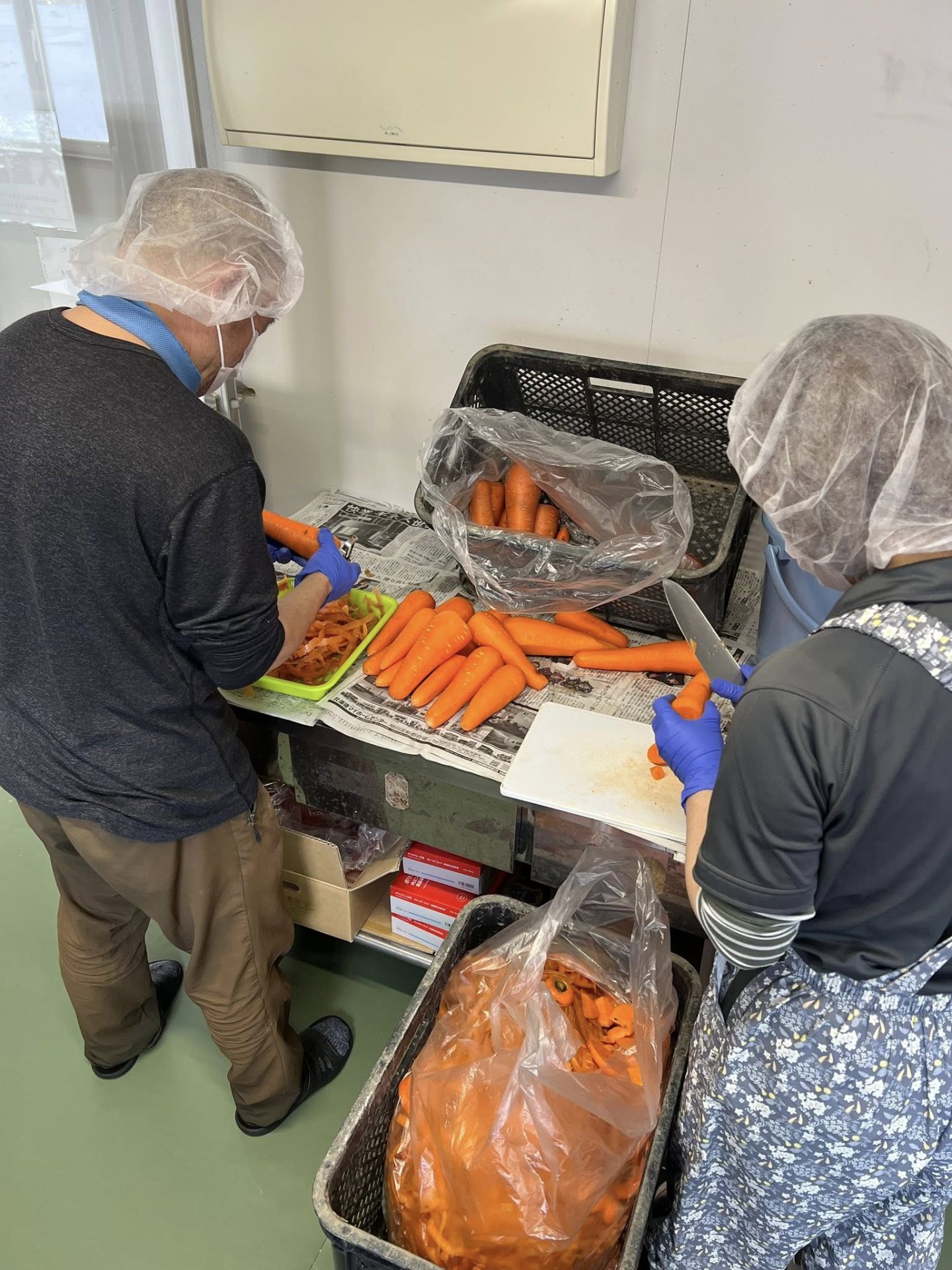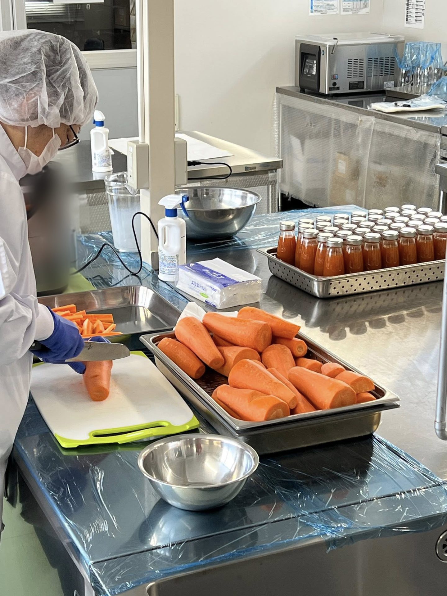 10月に収穫し、冷蔵庫で熟成させおいしさが増した「ちはま人参」。洗って皮を剥いて1次加工して…と、加工場は連日フル稼働です。