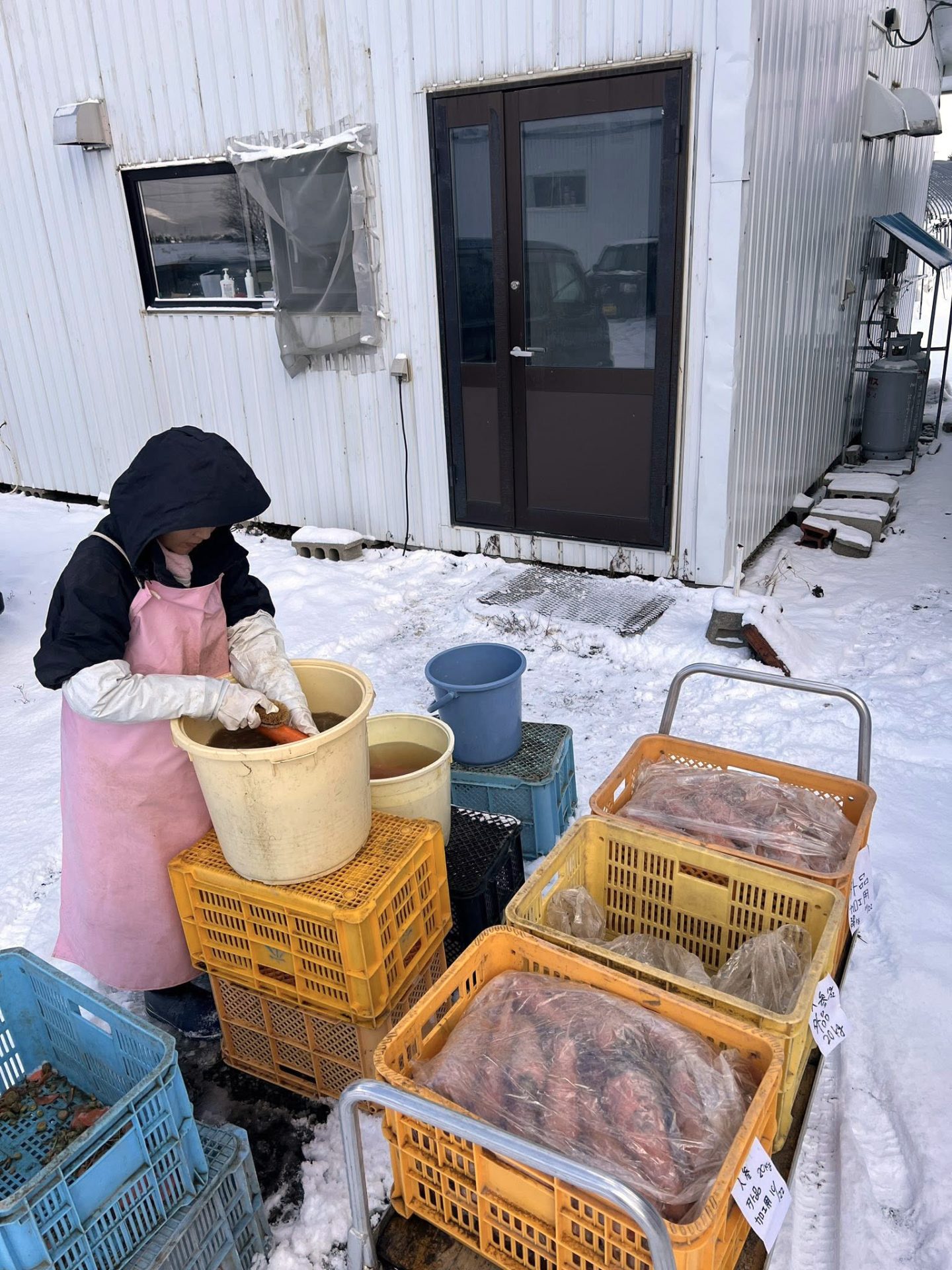 なんと雪降る外で!人参を洗ってます😳「寒くないの??」ってきいたら「ぬるま湯で洗っているから、以外と寒くないですよー」。