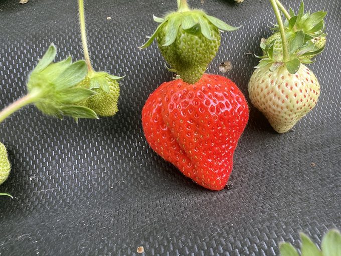あまおうイチゴを土耕で生産していて、これがとってもおいしいの!やっぱり土耕は土にイチゴの根を広く伸ばせるし、土のミネラルをしっかり吸うので旨みが違う。