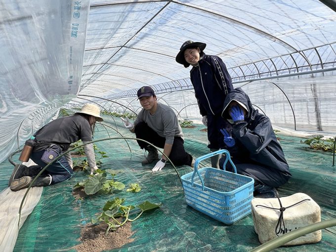まずは、メロンの生育初期、簡単な整枝作業からレクチャースタートです。緊張感もってやってくれています。1ヶ月後にはメロン整枝のプロにまで仕上げます。徐々に馴れていきましょー。