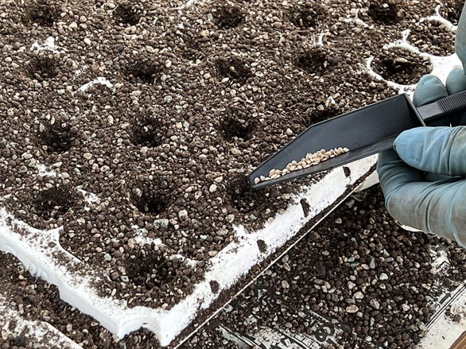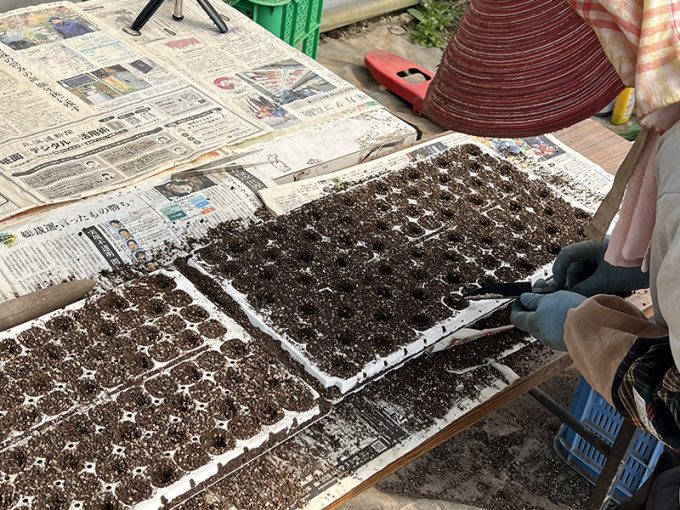 ミニトマトほれまるの種まきは「カリカリ君」という種まき補助器具を使って、126穴のプラグトレーに一粒ずつ落としていきます。これ、便利!