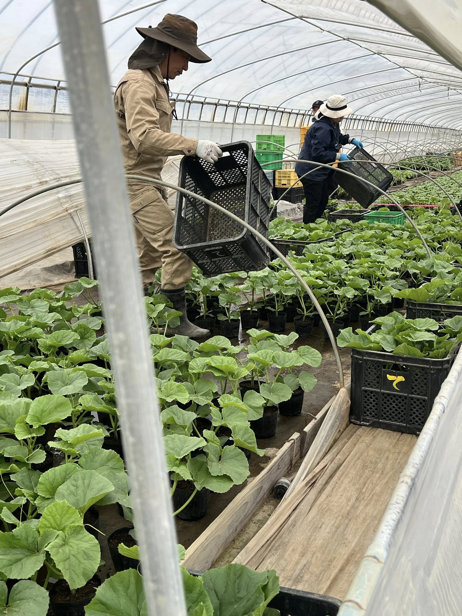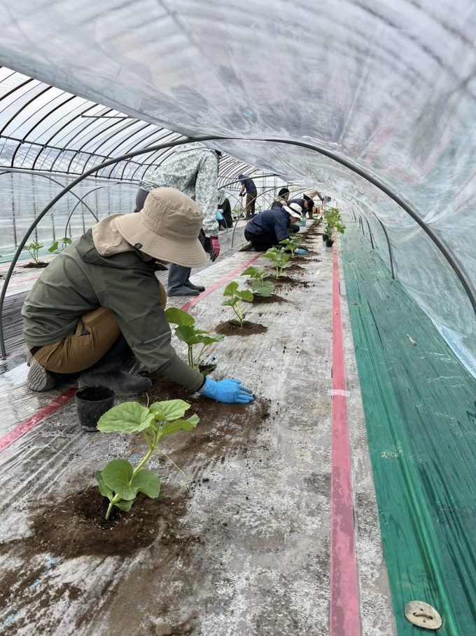 第5回目、7月中旬収穫予定のメロン苗をハウスに植えました。スタッフも増えたので仕事が早いです。