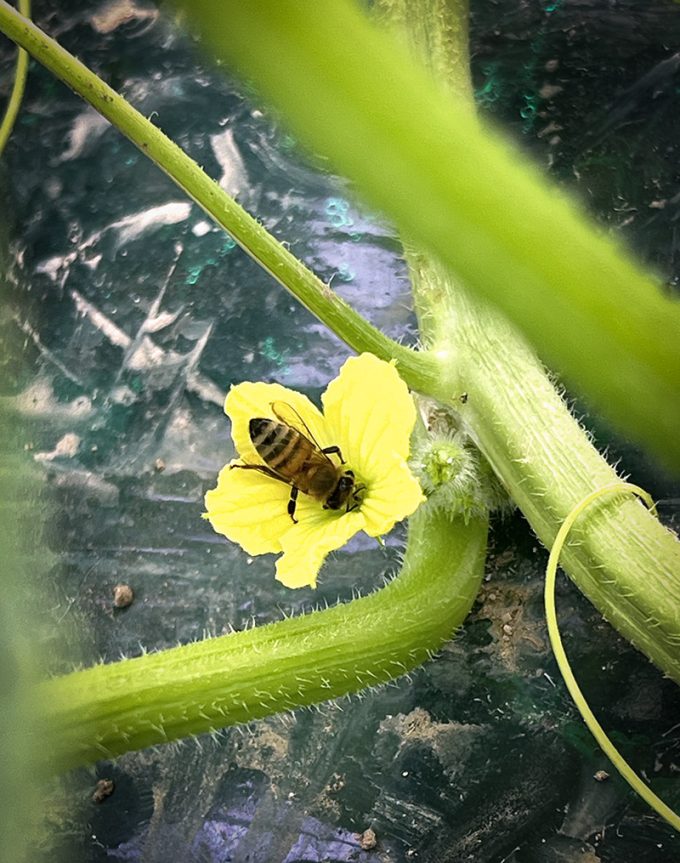太陽が照ると、ブンブン飛んで雌花と雄花を行ったり来たり。受粉作業をちゃんとしてくれる頼もしいヤツなのです。かわいいし😍