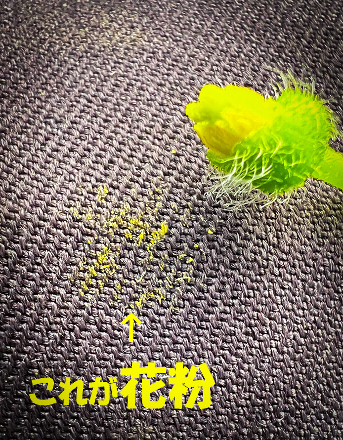 次に、雄花を採って花びら剥いて花粉が出ているか?をチェック。雄しべを袖にグリグリしてみたら花粉を確認、ヨーシ👍