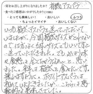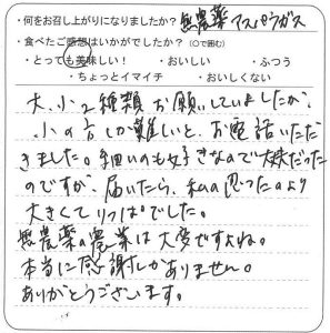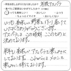 アスパラはここのものと決めております - いつも美味しい野菜を作り届けていただきありがとうございます。アスパラはこの時期ここのものと決めております。来年も美味しいアスパラを楽しみにしております。これからはメロンを楽しみに待っております。 埼玉県 匿名希望