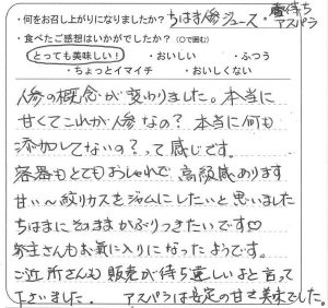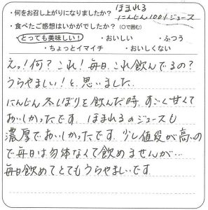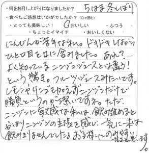 私は日本一おいしいニンジンジュースだと自負しています。おいしいから毎日飲みたくなる。冬~春まで毎日このにんじんジュースとミニトマトジュースを飲んでお腹も体も調子く、日々農作業に勤しんでいます。