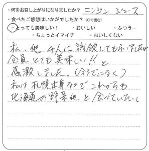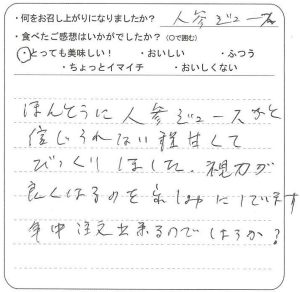 と同時に、体は食べたものでできている!ので、飲みやすくておいしいニンジンジュースをトマトジュースと交互に1本、必ず飲んでいます。効果があったのか1ヶ月ほどで数値が良くなってきましたが、これからも油断せずに健康第一で農業人生を生き続けたいと思っています。
