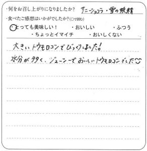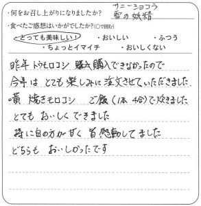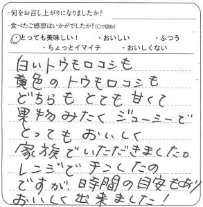 ジューシーで甘~いトウモロコシの美味しさが口の中に広がりますよ!黄色の「サニーショコラ」と白色の「雪の妖精」の食べ比べをお楽しみください。 食後、あなたのご感想お待ちしていおります♪