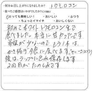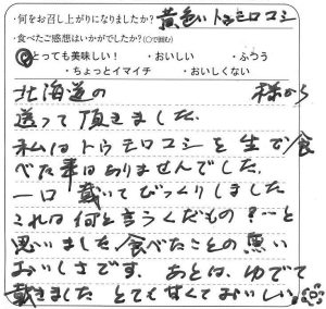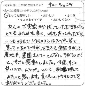 寺坂農園が育てたトウモロコシ「サニーショコラ」を食べた関東方面の〇トーヨーカ堂青果担当者が思わず言った言葉です。