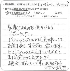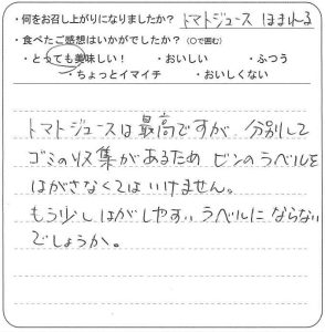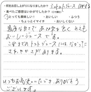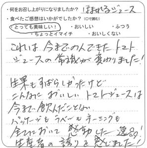 私は好みにトマトジュースを製品化するに当たって、全国からいろんなトマトジュースを取り寄せて飲んでみました。濃厚なのに飲みやすい、私は「日本一おいしい!」と思っているミニトマトジュースです。