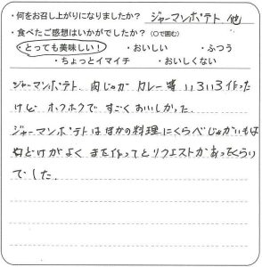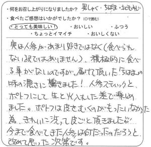 今まで食べてきた人参は何だったのだろう - 実は人参があまり好きではなく(食べられない訳ではありません)、積極的に食べる事がないのですが、届けて頂いた「ちはま」の味の濃さに驚きました!人参スティックと、ポトフにして生と火入れした差で楽しめました。ポトフは皮をむくの […] また作ってとリクエストがあったくらいでした - ジャーマンポテト、肉じゃが、カレー等いろいろ作ったけどホクホクですごくおいしかった。ジャーマンポテトはほかの料理にくらべ、じゃがいもは口どけがよくまた作ってとリクエストがあったくらいでした。 長崎県 匿名希望 様