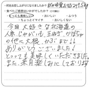 新鮮で土のにおいがしておいしかった - メロンの代替で送っていただきました。新鮮で土のにおいがしておいしかった。特に人参は太くて甘かったです。娘にもおすそ分けしました。どうぞ、これからもいいメロン、野菜を作って下さい。 三重県 匿名希望 様 富良野 一度は伺ってみたいです - 感想は届いて直ぐこの文を書いているので、まだ食べていません(笑)これから、シチュー、カレー等に使用させて頂きます。一人の為、ゆっくり頂きます。玉ねぎは大好きです。毎月のじゃがいもも美味しく、シチューは楽しみです。富良野  […]