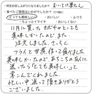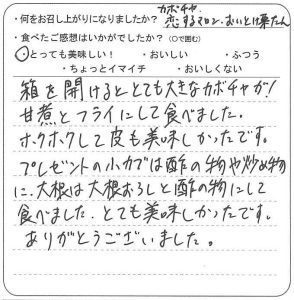 フライと甘煮作って食べました - 11月に買ったカボチャ とっても美味しかったので、また注文しました。さっそくフライと甘煮作って食べました。美味しかったので、あちこちの友人に送ったら「とても美味しい」と喜んでくれました。忙しい中、送って頂きありがとうござ […]