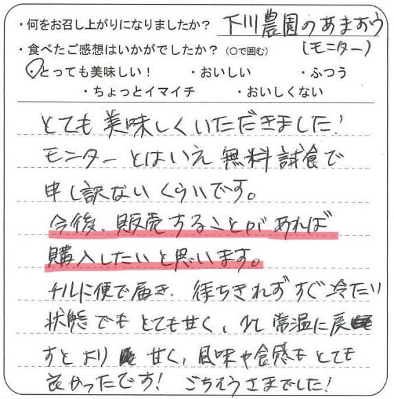 チルド便で届き、待ちきれずすぐ冷たい状態でもとても甘く、少し常温に戻すとより甘く、風味やしょっかもとても良かったです!ごちそうさまでした!