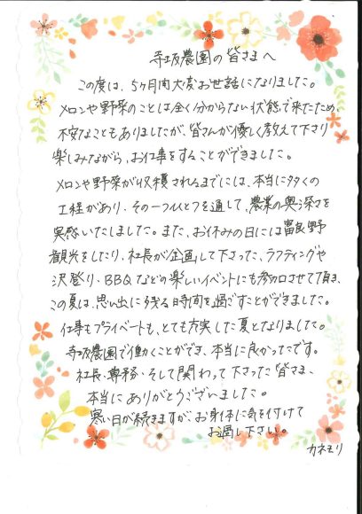 寺坂農園で働くことができ、本当に良かったです。社長、専務、そして関わって下さった皆様、本当にありがとうございました。