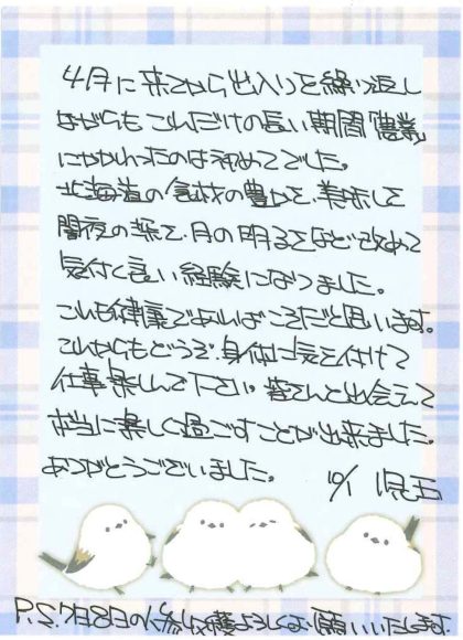 皆さんと出会えて本当に楽しく過ごすことができました。ありがとうございました。